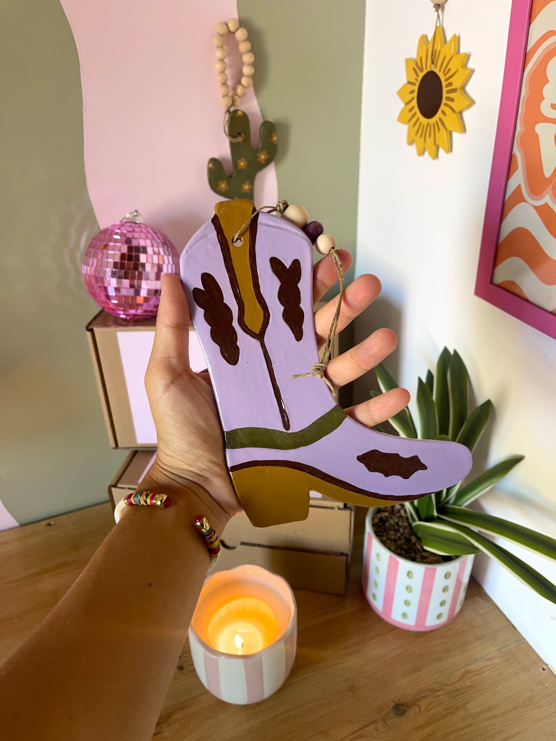 ✔️ 3 médaillons en argile faits main (1 cactus, 1 tournesol et une botte)